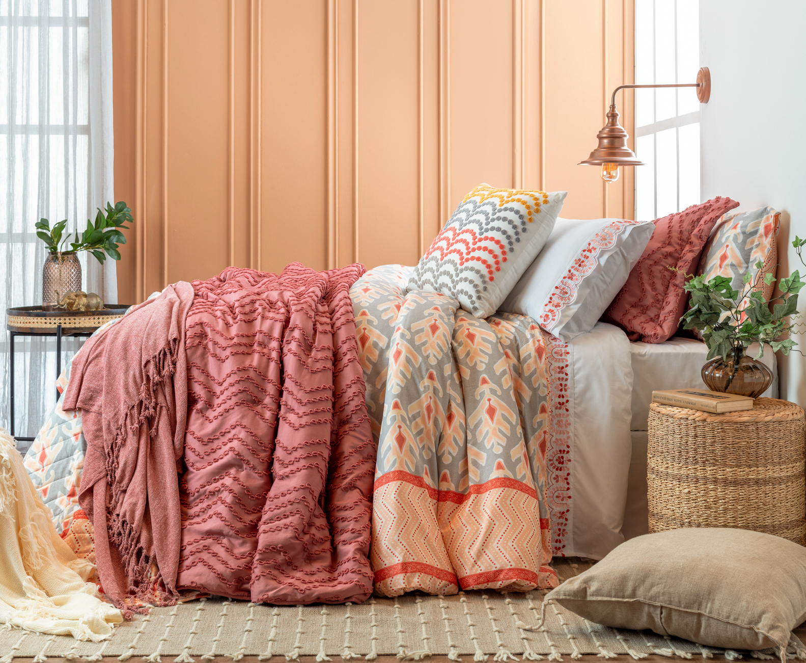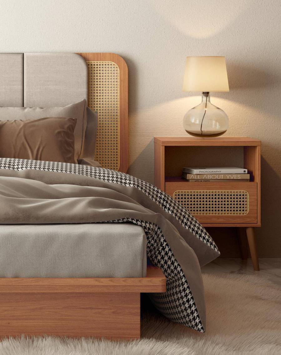 La versatilidad de este estilo es tan grande que, por supuesto, permite usar otro tipo de muebles como velador de dormitorio. Por ejemplo, este pouf de mimbre o esta mesa lateral redonda. Ambos, eso sí, de fibras naturales, la materialidad favorita del estilo Boho Chic.