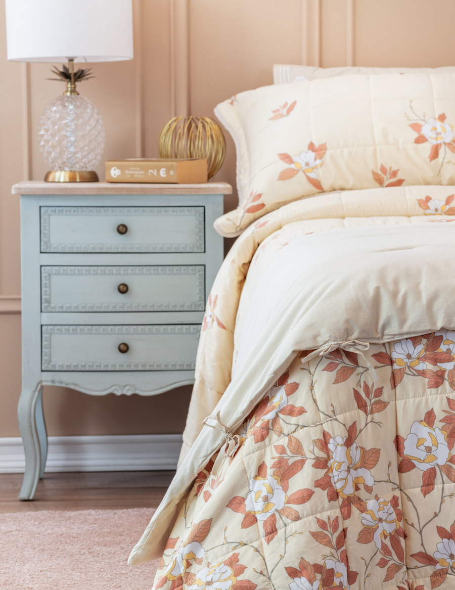 Con detalles románticos y colores pastel, este velador de dormitorio es ideal para un dormitorio Coquette.