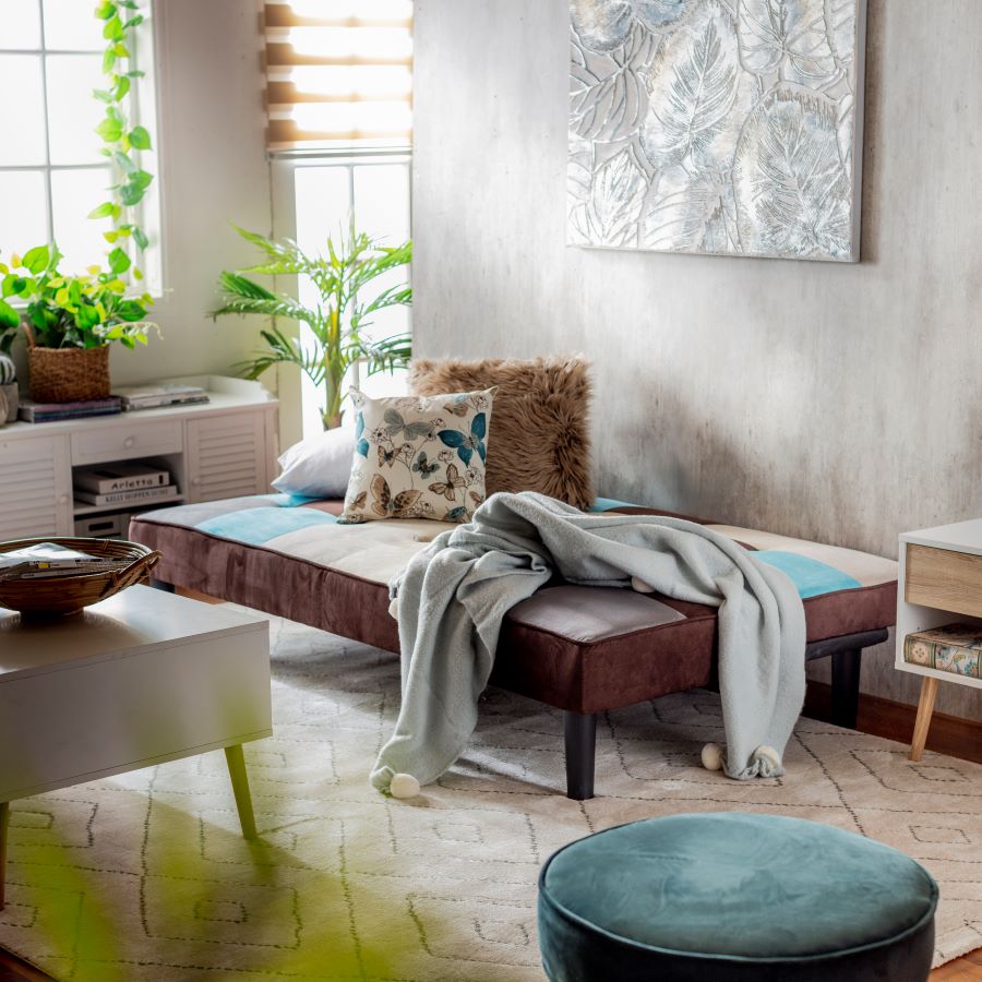 Para decorar un living pequeño con poca plata, lo ideal es escoger muebles que cumplan varias funciones, como por ejemplo, un futón. Funcionará muy bien como sillón, y cuando lo necesites, podrás abrirlo y usarlo como cama.