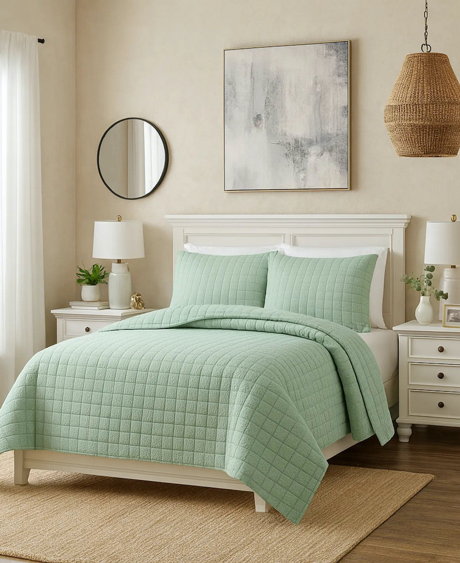 El verde menta y el verde oliva serán los nuevos neutros del 2026. Este quilt con textura cuadrada aportará calma, orden y frescura a la decoración de tu dormitorio.